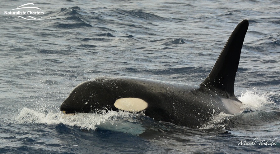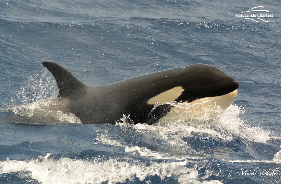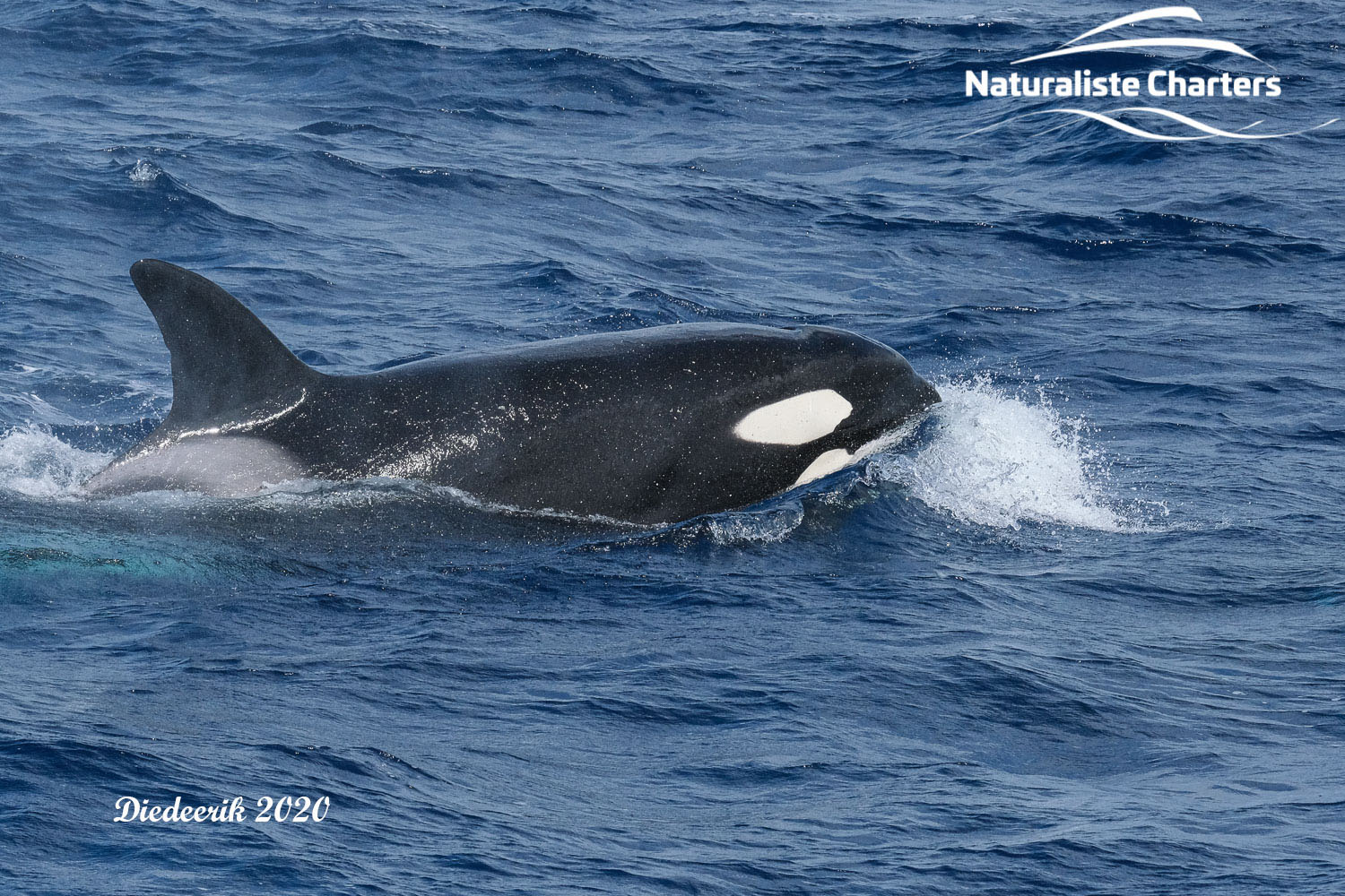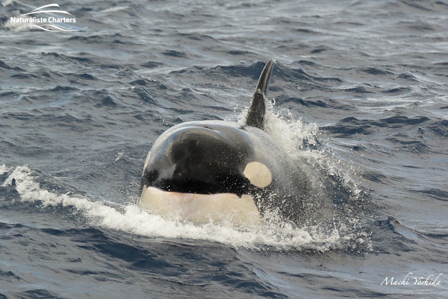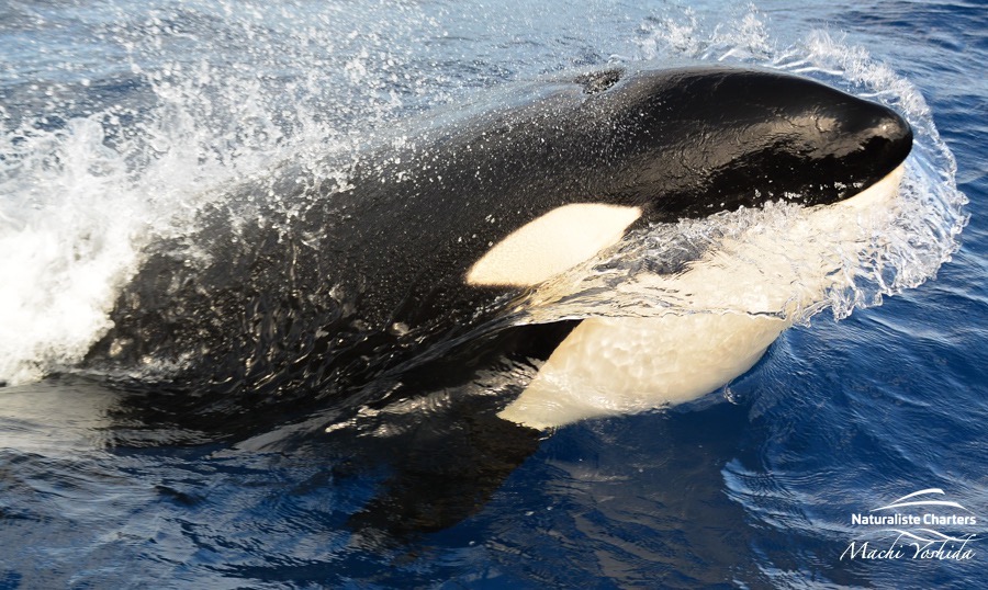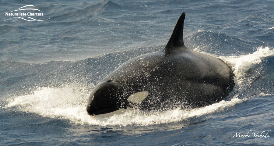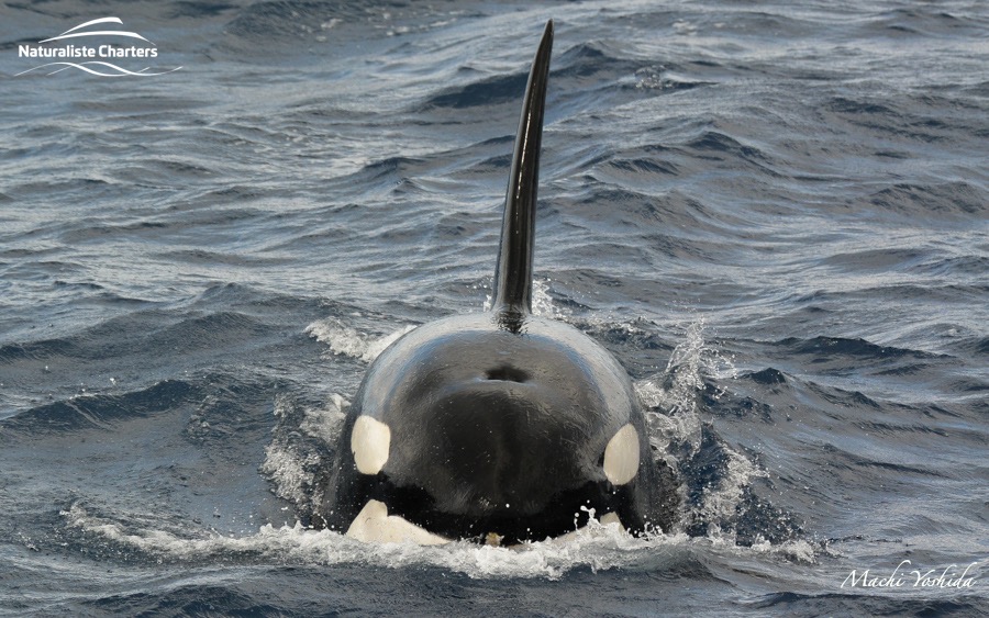 We didn’t find orca until after lunch today, making it all that more rewarding when we sighted that first fin slicing through the surface. We had searched all the usual places, S-Bends, Occy’s Garden and Shrek’s Head before rolling the dice and heading deep south toward the 2000m contour line. It is a rarer sight to encounter the orca where we did today, but usually, when we do it pays off! We first spotted a skyscraper-sized dorsal fin between the Knob and Henry Canyon. The trench systems between the two canyons exceed 2500m at their deepest points and is where we hit the JACKPOT today, to say the least! Two large male dorsal fins soon turned to three, four, FIVE further in the distance. We encountered some old friends for the first time this season, Koomba, Mako, Chalky, Maleko and of course Nibbles and Digby were there too! The five+ pods were all intermingled over three-mile, male fins scattered through the chaos! Juveniles darted toward us, almost every time turning upside down so their underbellies glowed as they darted across and under the bow! NOBODY knew where to look, spy-hops, breaches, and tail flicks, all the way around the clock!