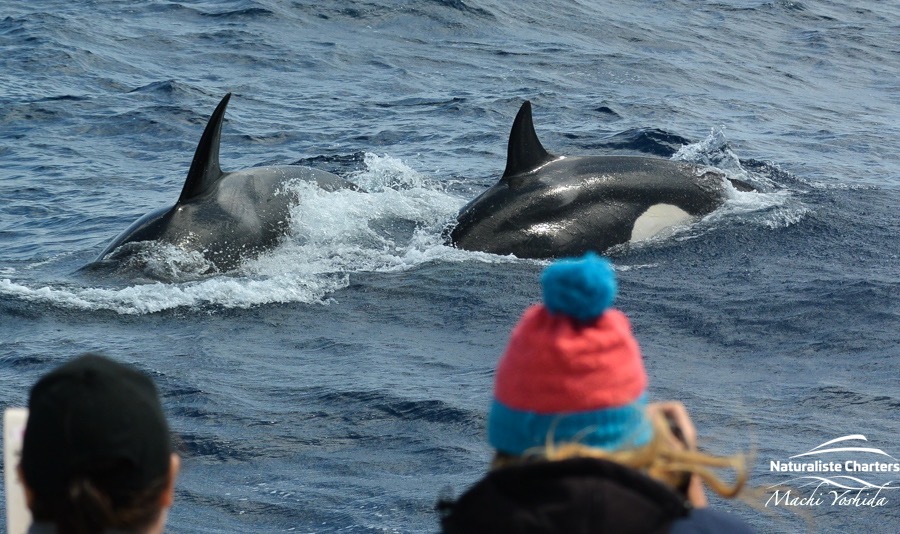 Such social behaviour from this many pods has only ever been encountered one other time over our 6 years out here in the Canyon, which involved similar courtship and mating interactions. The males were showing off to the seemingly endless array of potential female courters! The ACTION quickly hifted from such a diverse range of activities occurring at every angle to EVERY pod surging in one direction. The pods grouped into their tight echelon formations, three on our left, two on our right. We also had the “nursery” of surging matriarchs and their calves porpoising right next to the vessel as everyone cheered in awe! Razor and Blade leading the way! As we slowed down the pods all joined into two MASSIVE lines, honestly, we couldn’t keep count, at LEAST 60+ orca were headed toward and under our vessel. Customers were scattered from the back deck to the bow and everywhere in between as they witnessed a canyon FIRST! It was as if the entire Bremer Bay orca population were in one place, the largest social encounter we have EVER witnessed! SO MANY familiar faces (or dorsals) cruised past us including Lucky, Slug, Malibu, Bindi, Dot and even MORE that we had NEVER seen before. This moment will go down in the history books, leaving many in tears or the widest grins you’ve ever seen. Another great day for Bremer Bay Whale Watching!